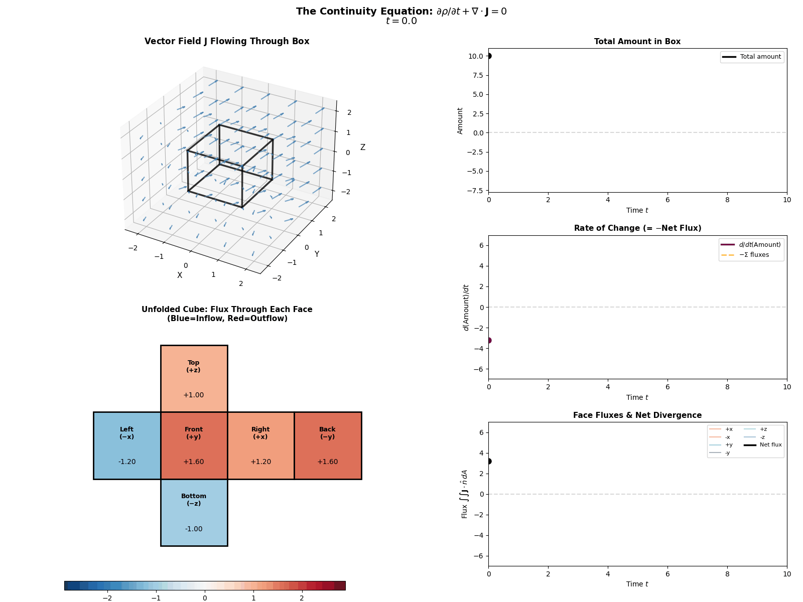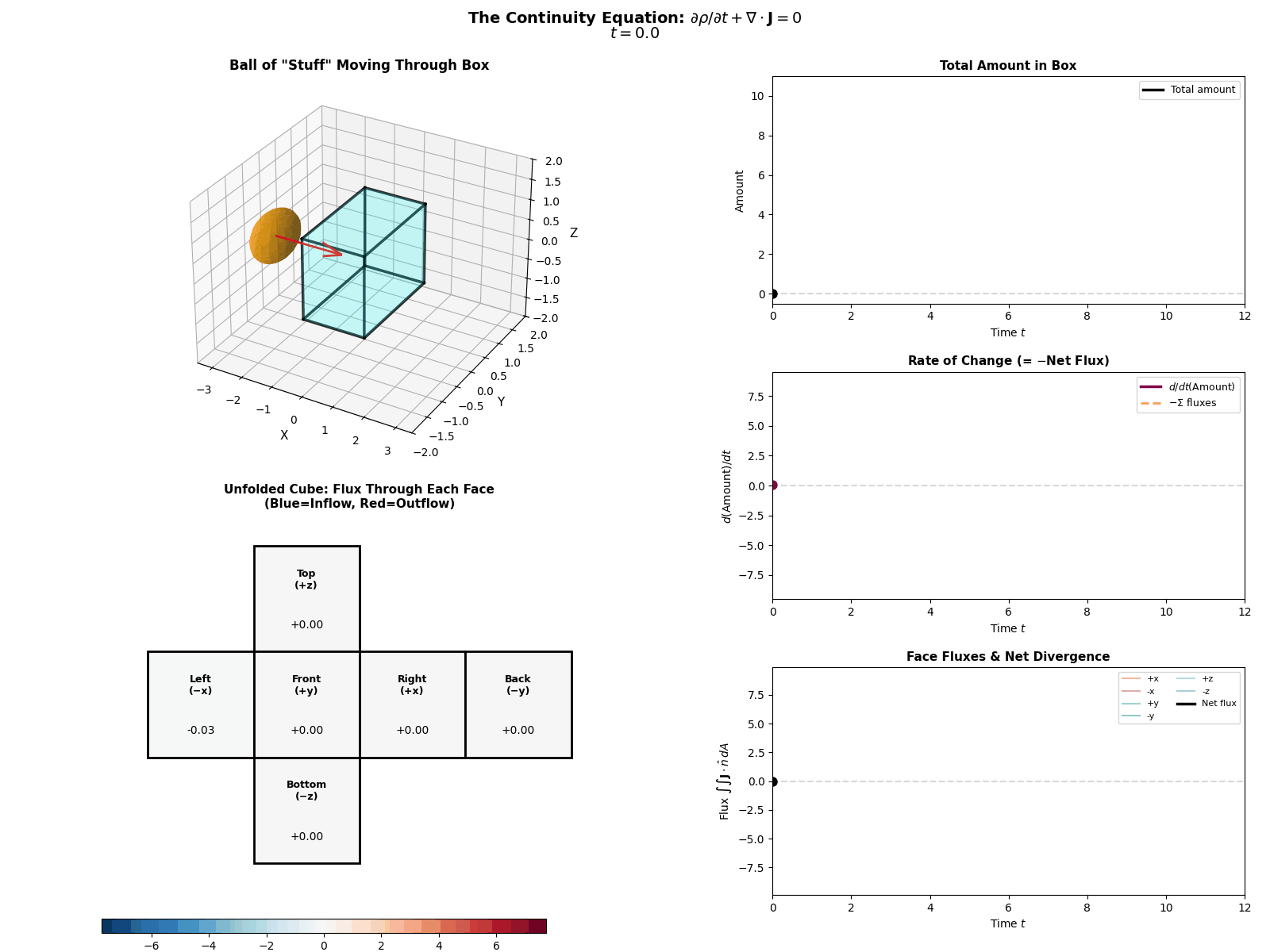 \[\frac{\partial p(x, t)}{\partial t} = -\nabla \cdot J(x, t)\]Where \(\frac{\partial p}{\partial t}\) is the change in probability at a specific spot, \(J\) is the Probability ‘Flux’ (or ‘current’) describing where the probability is flowing, \(\nabla \cdot J\) is the the ‘divergence’, measuring how much “stuff” is leaving a point (but can also be negative, so also measures stuff entering a point).