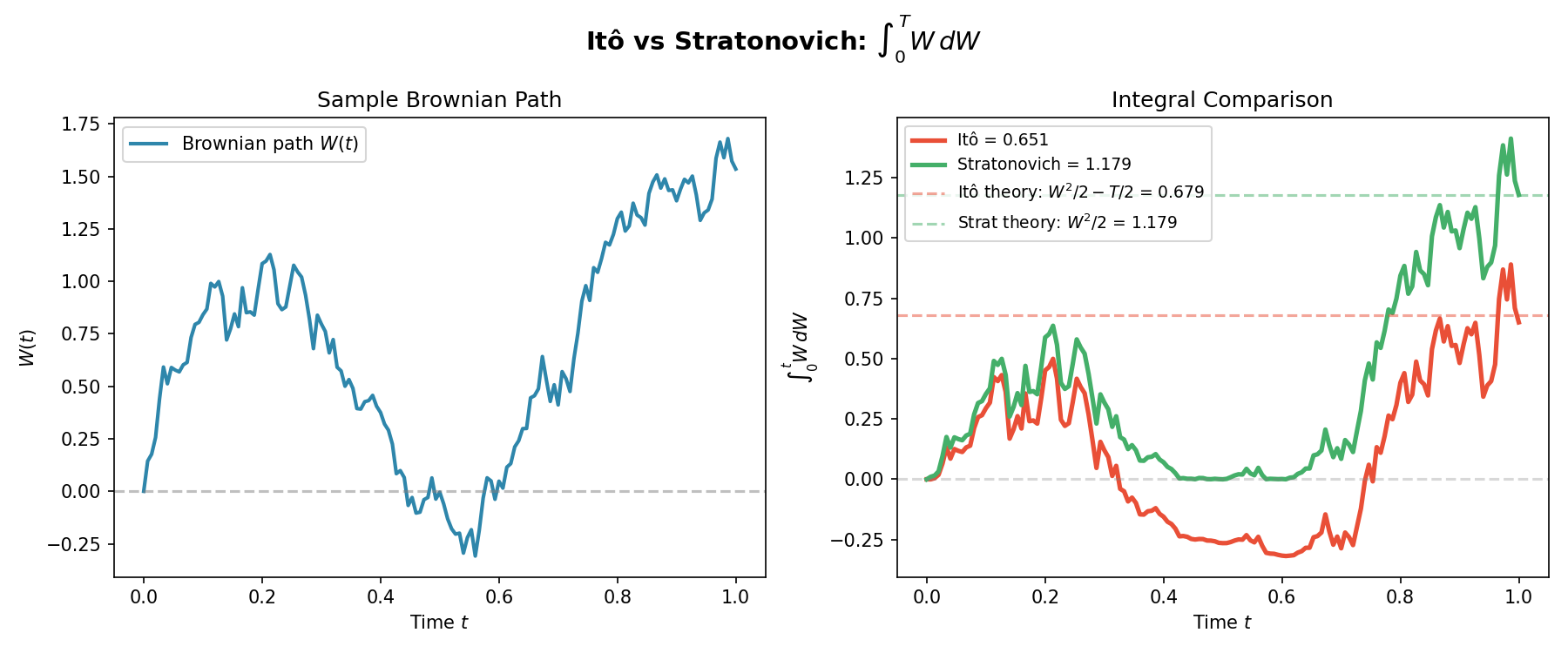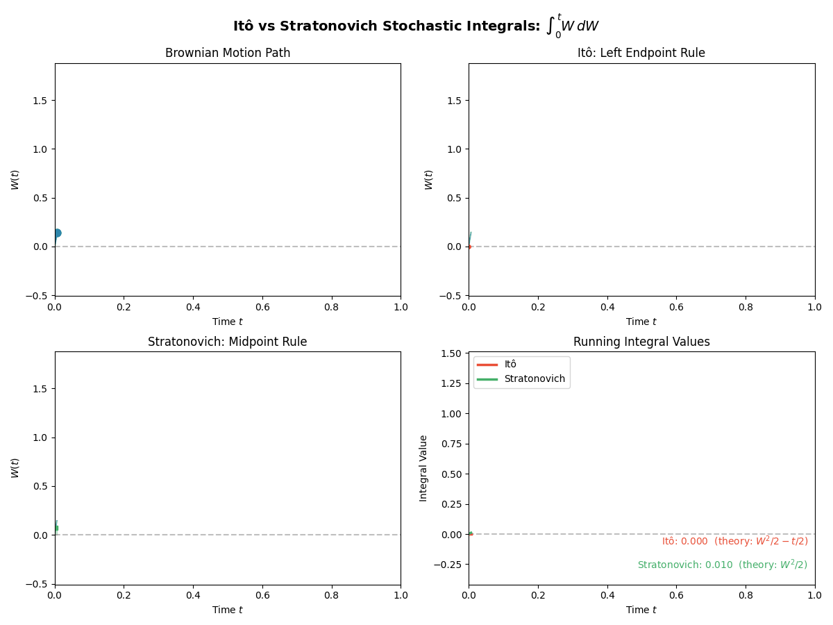 TL;DR: We will stick to Ito for simplicity in sampling algorithms, but we have to be careful with our calculus rules. Below is a gif showing some an example difference between the two for the same path.