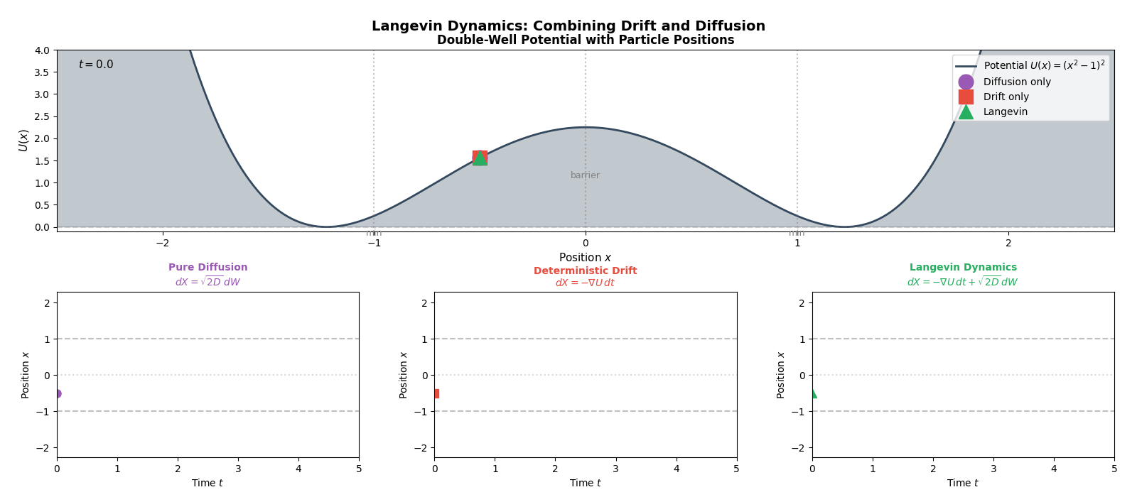 In conceptual terms: If your energy landscape \(U(x)\) has two deep valleys separated by an infinitely high wall, your algorithm isn’t ergodic. It will get stuck in one valley and never “see” the other, giving you a biased view of the distribution. The noise term \(dW\) is what provides ergodicity by allowing the particle to climb over (or tunnel through) energy barriers.